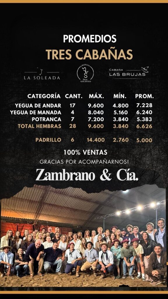 Los ejemplares de raza Criolla comercializados por Zambrano y Cía en el remate denominado Tres Cabañas fueron colocados en un 100% de la oferta presentada.-