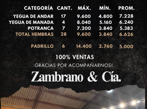 Los ejemplares de raza Criolla comercializados por Zambrano y Cía en el remate denominado Tres Cabañas fueron colocados en un 100% de la oferta presentada.-…